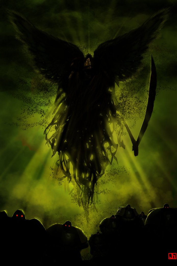 Slowly, Mortarion rounded on his former First Captain, letting his tremendous shadow fall across Typhus as he glowered down at him. “Even after all that has happened, Calas, I am still master of this legion,” he growled. To emphasize the message, his grip on his scythe noticeably tightened as his wings spread. “Never forget that.”