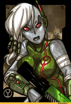 -Andromeda’s two main cyber-implants consist of a mind-impulse unit embedded into her skull (from which dozens of extendable plugs flow out in place of natural hair), and a pair of bionic eyes fixed into place by permanently-attached metal goggles. The eyes were a replacement of necessity as well as convenience, for Andromeda had been partially blinded by the neglect of her parents back on Mundus Brunnus.