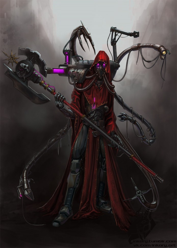 He sent a mental summons into the manifold. A second later, one of his Sicarians– a ghostly thing of tattered rags, elongated, limbs, serrated blades and a steel skull-mask– arrived, emerging out of an alcove and crawling along the wall above Kelethrex like some vile insect.