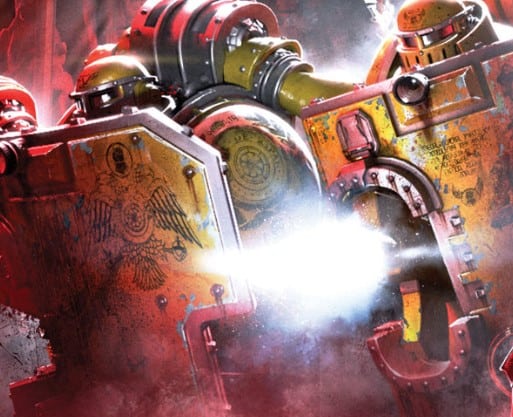 Seeing Castellan Gallemand and the Breachers slaughtered before their very eyes, the Imperial Fists’ resolve wavered for a moment. That moment ended, however, when immense, iron footfalls were suddenly heard from the north of the embattled deck. Ancient Ludovicus, the station’s resident Dreadnought, had been aroused from his slumber and was striding forth to join his brothers. Emboldened by the Dreadnought’s arrival, the Phalanx Warders advanced up to bring the fight to the Terror Squads, while the Tactical Marines moved up as well, trying to get as many fields of fire as they could through the narrow doorway they were forced to navigate.