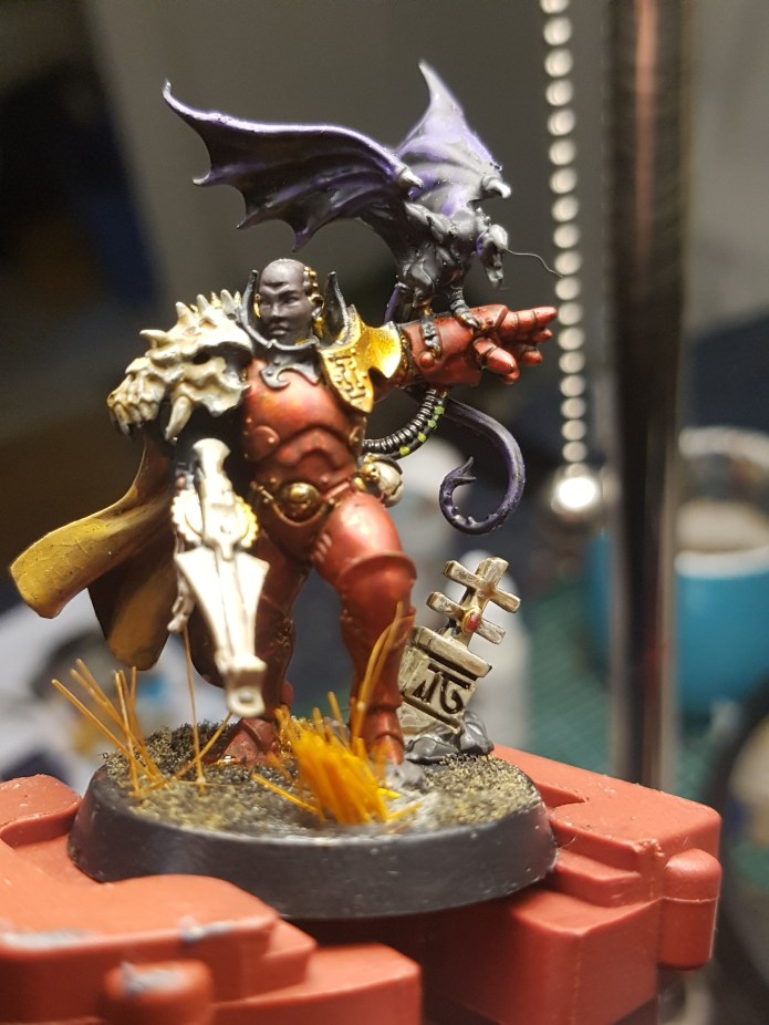While I was tempted to go for something vaguely Sororita-y, I wanted to take a break from painting Sisters of Battle, and instead wanted to try something different. As fate would have it, I had been considering getting the model for Inquisitor Kyria Draxus– what with her fancy armour, looted borrowed Eldar weaponry, pet dragon and mysterious lack of hair– for quite a while now, and so decided to use her as my entry for the painting contest.